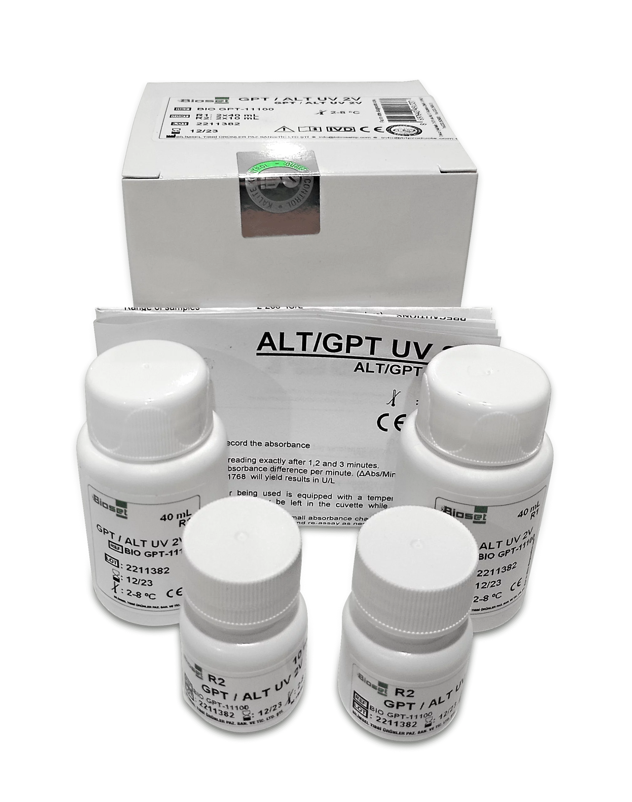 BIOSET ALT/GPT UV 2V adalah reagen diagnostik biokimia yang dirancang untuk in vitro pengukuran aktivitas enzim Alanine Aminotransferase (ALT) (juga dikenal sebagai Glutamic Pyruvic Transaminase/GPT) dalam serum atau plasma manusia menggunakan metode UV kinetik IFCC pada biochemistry analyzer otomatis atau semi-otomatis. Reagen ini biasanya dikemas dalam dua vial (2 V) berisi R1 dan R2 yang siap pakai.